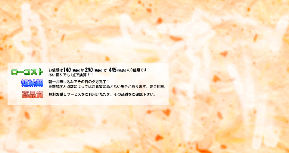 超激安で短納期!朝一お申し込みでその日の夕方完了(難易度と点数によってはご希望に添えない可能性があります。要ご相談)でハイクオリティな仕上がりとなっておりますので是非一度お試し下さい! まずはご気軽にご連絡下さい!